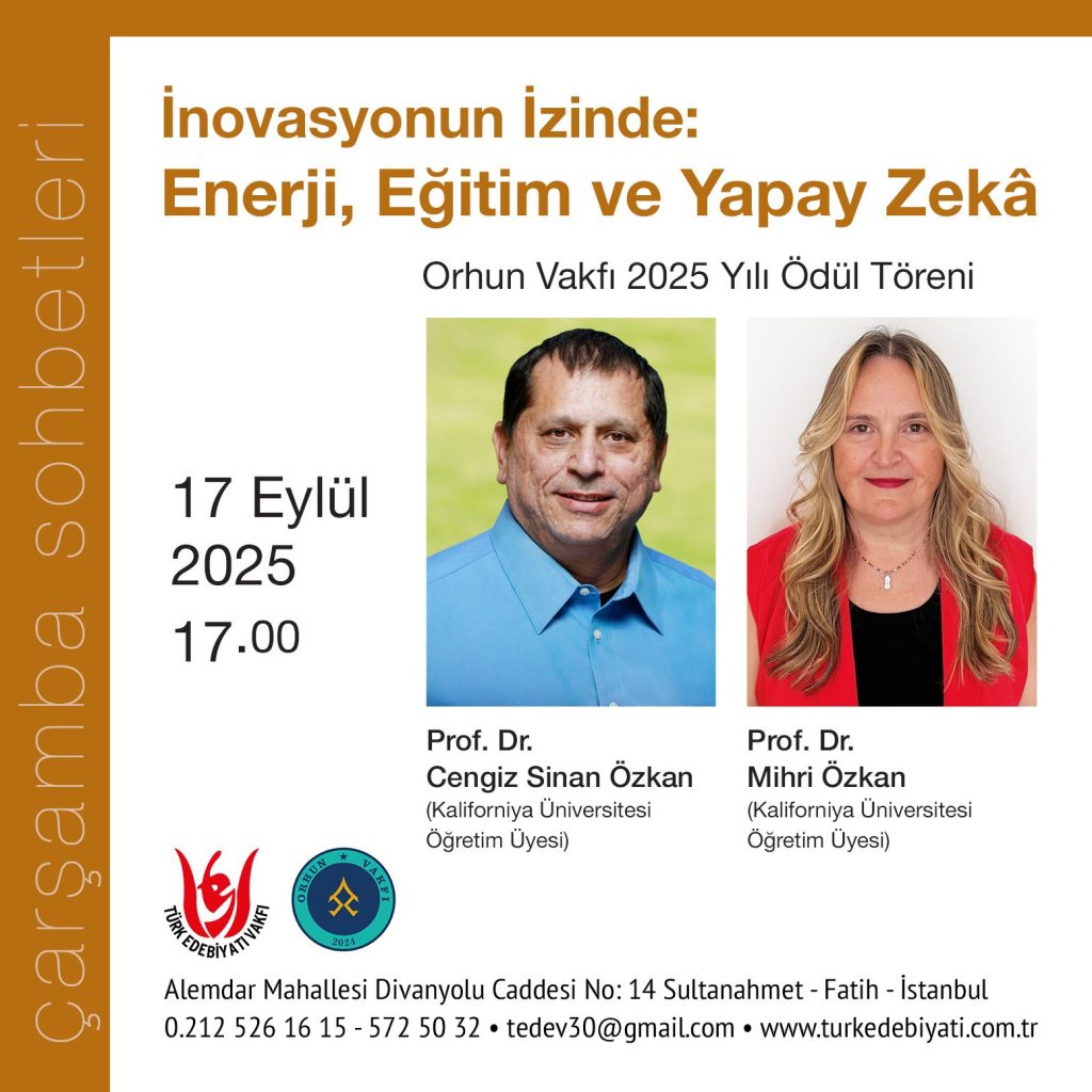 17 Eylül 2025 Çarşamba günü Türk Edebiyat Vakfı’nda düzenlenecek törende, bilim dünyasında çığır açan çalışmalarıyla öne çıkan Prof. Dr. Cengiz Sinan Özkan ve Prof. Dr. Mihri Özkan ödüle layık görülecek.